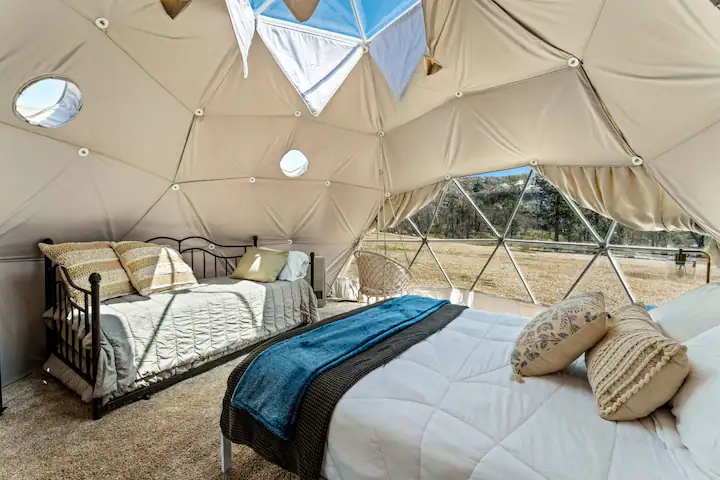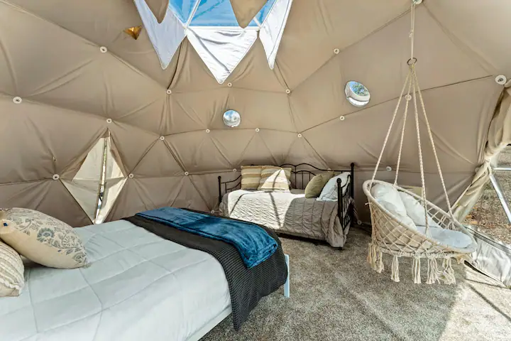 Immerse yourself in the splendor of the natural world at this remarkable sanctuary. Our Geodesic Dome, a perfect fusion of rustic charm and modern convenience, is equipped with power and running water, ensuring a comfortable wilderness experience. Booking this dome opens the gates to an expansive 140-acre wonderland, replete with serene fishing ponds, meandering hiking trails, and breathtaking mountain vistas. Picture yourself wandering through an organic apple orchard, the scent of ripening fruit mingling with fresh mountain air, under a sky glittering with stars.
